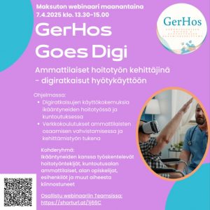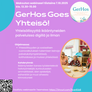 TAPAHTUMAKALENTERI Tulevia tapahtumia: Seuraava GerHos webinaari on 7.10.2025 klo 13.30 – 15.00. Teemana GerHos goes yhteisö – yhteisöllisyyttä digillä ja ilman. Menneitä tapahtumia: